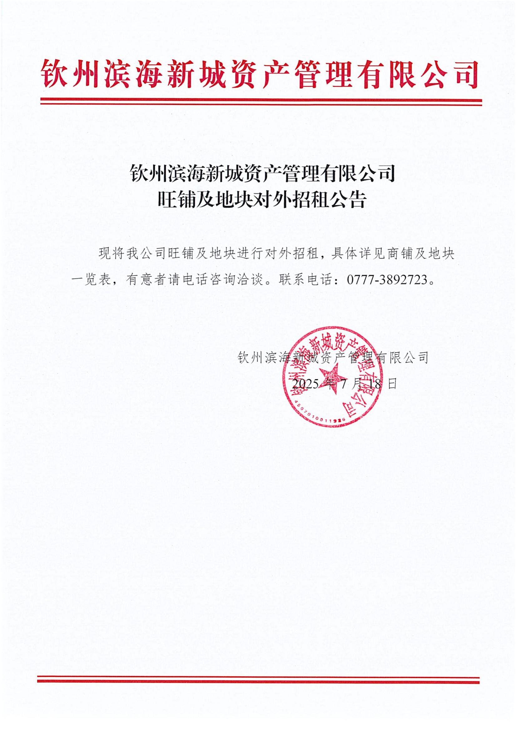 欽州濱海新城資產(chǎn)管理有限公司旺鋪及地塊對(duì)外招租公告