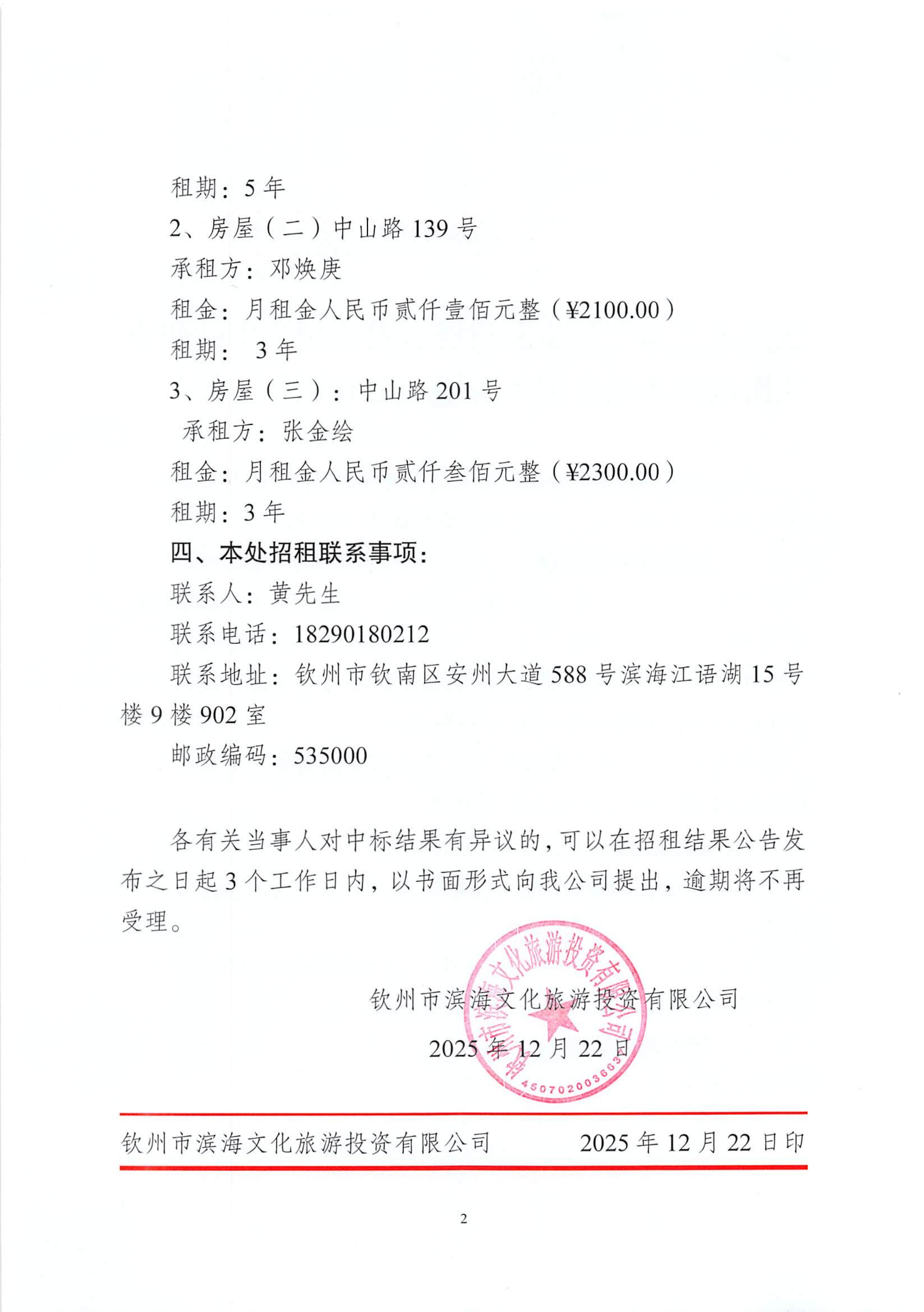 欽州市濱海文化旅游投資有限公司關(guān)于欽州市老街范圍3處房屋(場地)公開招租結(jié)果公示(沙尾街20號、中山路139號、中山路201號)
