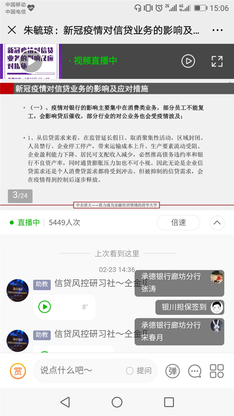2020年2月23日下午,我公司員工集體參加銀行信貸風(fēng)險專家朱毓瓊老師主講的“新冠疫情對信貸業(yè)務(wù)的影響及應(yīng)對措施”專題網(wǎng)課。通過本次網(wǎng)課培訓(xùn),系統(tǒng)地學(xué)習(xí)了解新冠疫情對融資擔(dān)保行業(yè)的影響,充分認(rèn)識本次新型冠狀病毒肺炎疫情對融資擔(dān)保行業(yè)的影響和沖擊,以及學(xué)習(xí)各地監(jiān)管部門的最新政策和應(yīng)對措施。