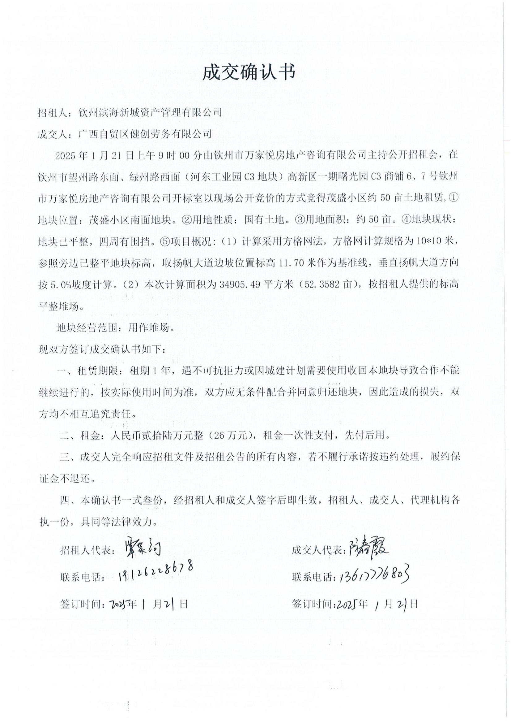 茂盛小區(qū)約50畝土地租賃(QZWJY2025-001)成交結果公告