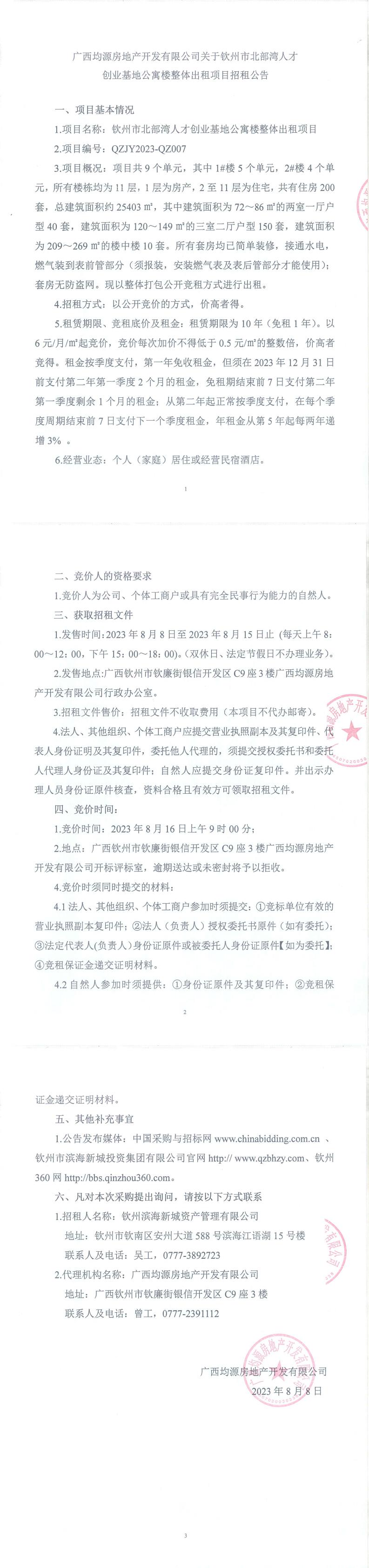欽州市北部灣人才創(chuàng)業(yè)基地公寓樓整體出租項(xiàng)目招租公告