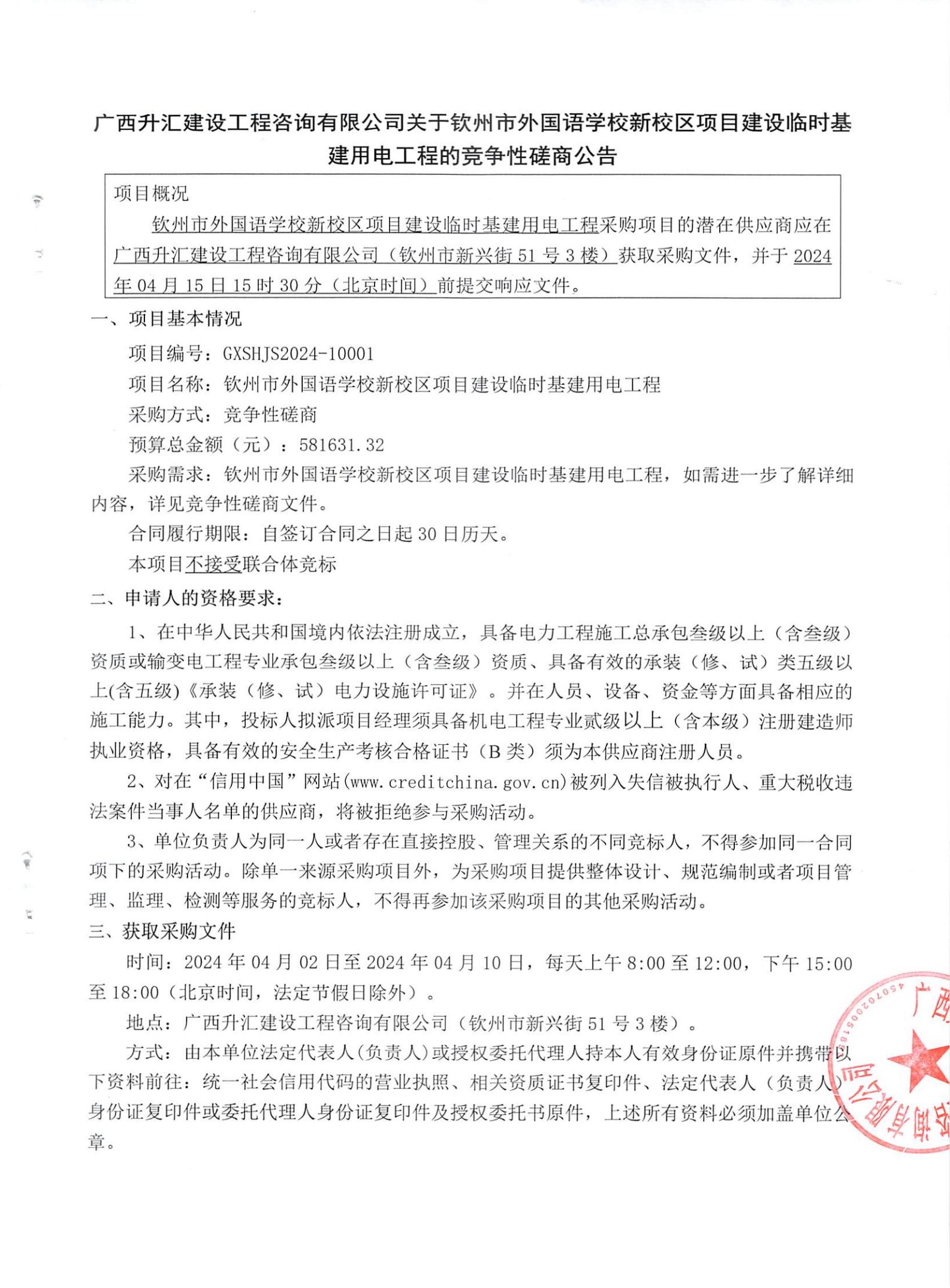 廣西升匯建設(shè)工程咨詢有限公司關(guān)于欽州市外國(guó)語(yǔ)學(xué)校新校區(qū)項(xiàng)目建設(shè)臨時(shí)基建用電工程的競(jìng)爭(zhēng)性磋商公告